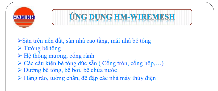 Lưới thép hàn HM-WIREMESH được sản xuất từ nhứng sợi thép kéo nguội có cường độ cao.Quy trình sản xuất được thực hiện trên hệ thống máy móc thiết bị tự động hóa. Quá trình hàn các sợi thép được liên kết với nhau trên nguyên tắc làm chảy dây thép kết hợp với áp lực. Những dây thép chảy ra ở những vị trí giao nhau và dính chặt vào nhau với một mặt cắt đồng nhất và không giảm chất lượng của thép